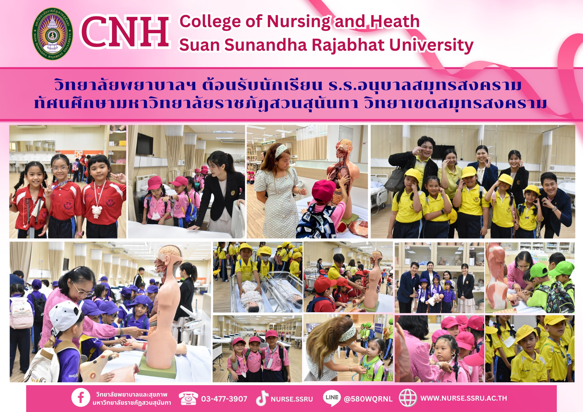 July 31st 2025 Suan Sunandha Rajabhat University, Samut Songkhram Campus visited elementary students an educational enrichment program to promote learning outside the classroom and explore environmental awareness. The students participated excursions related to local natural resources, learning about the essentials development and positive mindset about conservation in local communities. In addition to the students given a chance to visit College of Nursing and Health to experience fun learning activities about Human Anatomy led and assisted by the lecturers and staff of the College to understand, enjoyable, and engaging approach for young learners. This activity promoted not only fundamental knowledge but also aimed to inspire and encourage young learners to develop a positive attitude towards learning local resources. It aligns with the Sustainable Development Goals (SDGs) particularly..