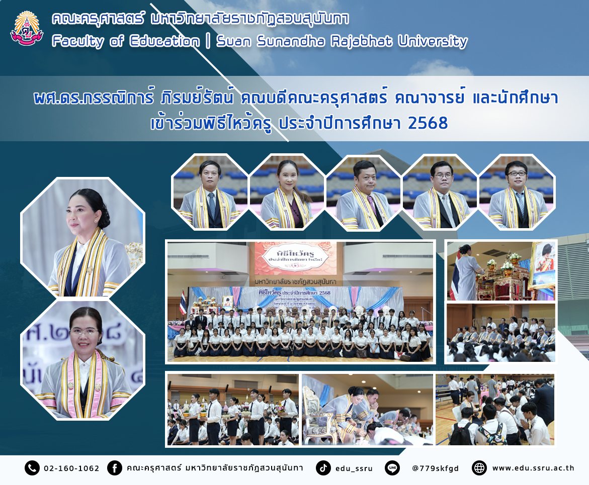 วันที่ 7 สิงหาคม 2568 นำโดย ผู้ช่วยศาสตราจารย์ ดร.กรรณิการ์ ภิรมย์รัตน์ คณบดีคณะครุศาสตร์ พร้อมด้วย คณาจารย์ และนักศึกษา คณะครุศาสตร์ มหาวิทยาลัยราชภัฏสวนสุนันทา เข้าร่วมพิธีไหว้ครู ประจำปีการศึกษา 2568 โดยมี รองศาสตราจารย์ ดร.ชุติกาญจน์ ศรีวิบูลย์ อธิการบดี จุดธูป เทียน บูชาพระรัตนตรัย ต่อด้วยเจิมหนังสือ และกล่าวให้โอวาทแก่นักศึกษาที่เข้าร่วมพิธีไหว้ครู ณ อาคารศูนย์สุขภาพเเละกีฬาสวนสุนันทา ชั้น 4