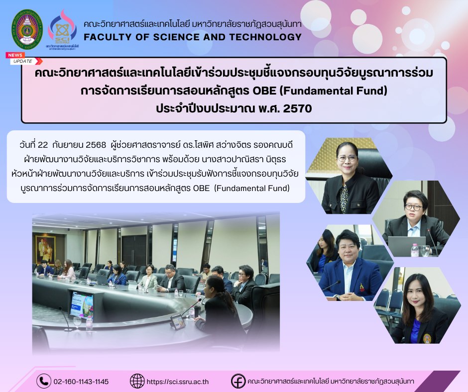 วันที่ 22 กันยายน 2568 ผู้ช่วยศาสตราจารย์ ดร.โสพิศ สว่างจิตร รองคณบดีฝ่ายวิจัยและบริการวิชาการ พร้อมด้วย นางสาวปาณิสรา นิตุธร หัวหน้าฝ่ายพัฒนางานวิจัยและบริการ เข้าร่วมประชุมรับฟังการชี้แจงกรอบทุนวิจัยบูรณาการร่วมการจัดการเรียนการสอนหลักสูตร OBE (Fundamental Fund) ประจำปีงบประมาณ พ.ศ.2570 โดยมี รองศาสตราจารย์ ดร.รจนา จันทราสา รองอธิการบดีฝ่ายวิจัยและพัฒนา เป็นประธานที่ประชุม และผู้ช่วยศาสตราจารย์ ดร.มรกต วรชัยรุ่งเรือง ผู้อำนวยการสถาบันวิจัยและพัฒนา เป็นผู้กล่าวรายงานชี้แจงกรอบการดำเนินงานวิจัย โดยมีวัตถุประสงค์ เพื่อมุ่งเน้นการบูรณาการงานวิจัยร่วมกับการจัดการเรียนการสอนหลักสูตร Outcome-based education : OBE (Fundamental Fund) ประจำปีงบประมาณ พ.ศ.2570 ซึ่งจัดโดย สถาบันวิจัยและพัฒนา ณ ห้องประชุมสภามหาวิทยาลัย ชั้น 5 อาคาร 31 มหาวิทยาลัยราชภัฏสวนสุนันทา