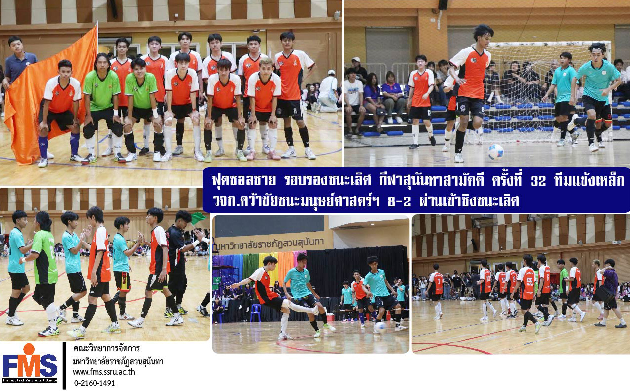 เมื่อวันที่ 20 กันยายน 2568 การแข่งขันกีฬาฟุตซอล สุนันทาสามัคคี ครั้งที่ 32 ทีมนักกีฬาฟุตซอลคณะวิทยาการจัดการ คว้าชัยชนะทีมคณะมนุษย์ศาสตร์และสังคมศาสตร์ด้วยคะแนน 8-2 ผ่านเข้าสู่รอบชิงชนะเลิศ พบทีมคณะวิทยาศาสตร์และเทคโนโลยี ณ อาคารศูนย์สุขภาพและกีฬาชั้น 4 กองพัฒนานักศึกษา มหาวิทยาลัยราชภัฏสวนสุนันทา