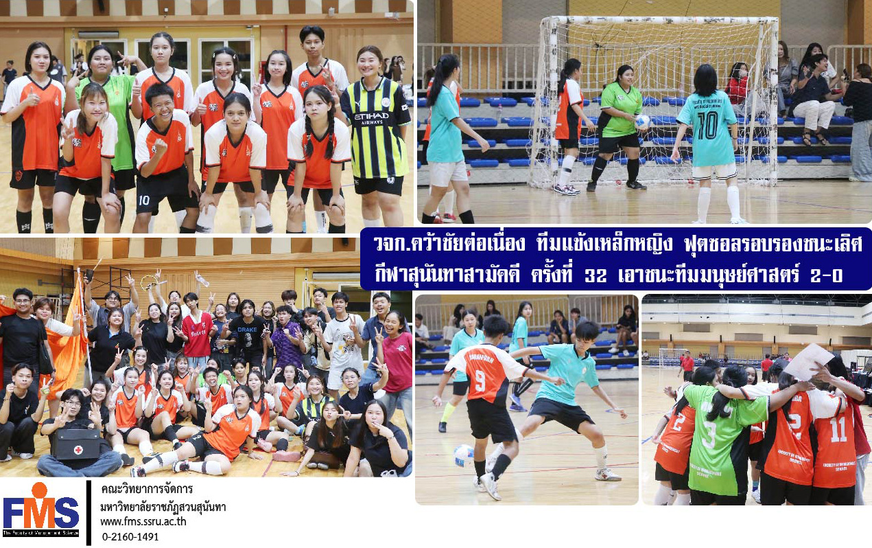 เมื่อวันที่ 20 กันยายน 2568 การแข่งขันกีฬาฟุตซอล สุนันทาสามัคคี ครั้งที่ 32 ทีมฟุตซอลหญิง คณะวิทยาการจัดการ คว้าชัยชนะทีมคณะมนุษย์ศาสตร์และสังคมศาสตร์ด้วยคะแนน 2-0 ผ่านเข้ารอบชิงชนะเลิศ ณ อาคารศูนย์สุขภาพและกีฬาชั้น 4 กองพัฒนานักศึกษา มหาวิทยาลัยราชภัฏสวนสุนันทา