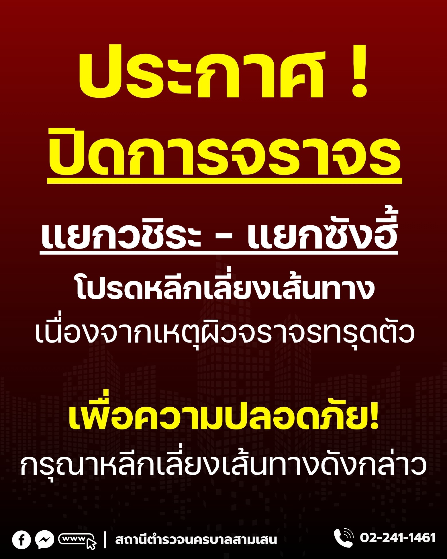 ประชาสัมพันธ์ หลีกเลี่ยงเส้นทาง สน.สามเสน ขอแจ้งปิดการจราจร แยกวิชรพยาบาล – แยกซังฮี้