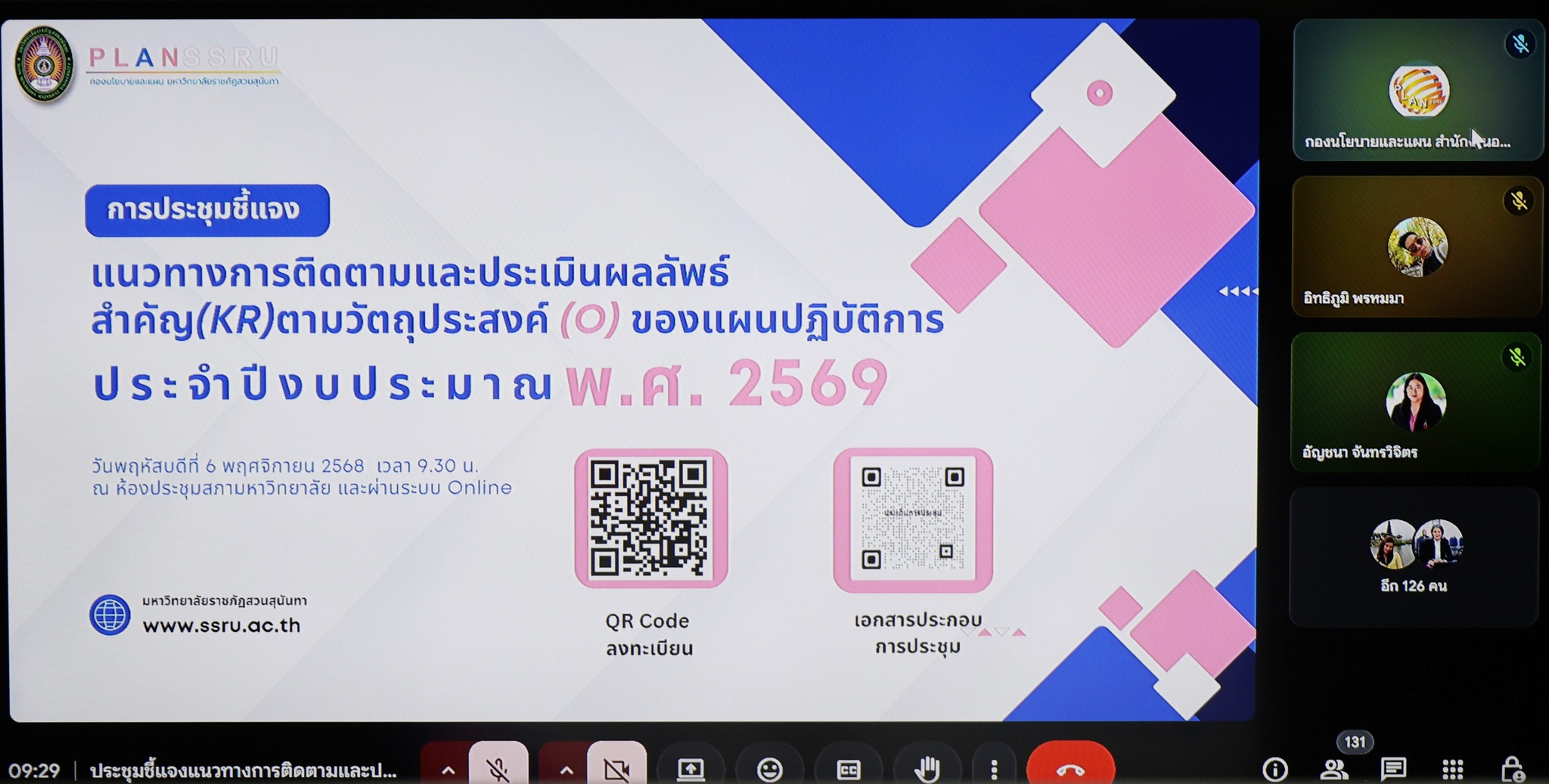วันที่ 6 พฤศจิกายน 2568 ผู้ช่วยศาสตราจารย์ ดร.ชุติมา คล้ายสังข์ คณบดีคณะวิทยาการจัดการ พร้อมด้วยอาจารย์ ดร.อิทธิภูมิ พรหมมา รองคณบดีฝ่ายแผนงานและประกันคุณภาพ นางสาวปาริฉัตร์ จันทร์นวล หัวหน้าฝ่ายแผนงานและประกันคุณภาพ และนางสาวพูลศิริ พรหมกูล นักวิเคราะห์นโยบายและแผน (ชำนาญการ) เข้าร่วมการประชุมเพื่อรับทราบแนวทางการติดตามและประเมินผลลัพธ์ตามวัตถุประสงค์ (Objective and Key Results: OKR) ของแผนปฏิบัติการ ประจำปีงบประมาณ พ.ศ. 2569 โดยมีรองศาสตราจารย์ ดร.วิทยา เมฆขำ รองอธิการบดีฝ่ายแผนงานและประกันคุณภาพ เป็นประธานการประชุม มีผู้บริหารและบุคลากรที่เกี่ยวข้อง เข้าร่วมประชุม ณ ห้องประชุมสภามหาวิทยาลัย ชั้น 5 อาคาร 31 และการประชุมผ่านระบบออนไลน์โปรแกรม Google Meet