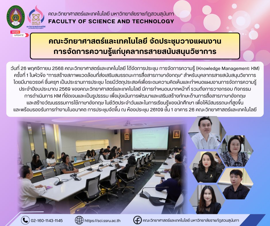 On November 26, 2025, the Faculty of Science and Technology organized the 1st Knowledge Management (KM) Meeting on the topic "Creating an Environment that Promotes English Communication Competency" for academic support staff. The meeting was chaired by Mr. Warong Chuenkrut. The objective was to brainstorm ideas and define the Knowledge Management plan for the Fiscal Year 2026. The meeting included defining roles and duties, as well as setting a clear and concrete framework for KM activities. The focus is on developing and enhancing English communication skills and creating a culture of English usage in daily life and student learning. This aims to achieve higher competency and readiness for future work. The meeting was held at Room 26109, 1st Floor, Building 26, Faculty of Science and Technology.