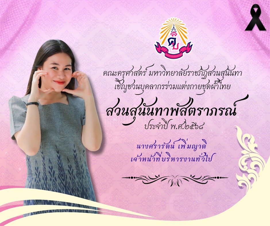 วันที่ 28 พฤศจิกายน 2568 บุคลากรคณะครุศาสตร์ มหาวิทยาลัยราชภัฏสวนสุนันทา ขอเชิญชวนบุคลากรร่วมแต่งกายชุดผ้าไทย "สวนสุนันทาพัสตราภรณ์" ประจำปี 2568 ตามนโยบายของมหาวิทยาลัยราชภัฏสวนสุนันทาและนโยบายของรัฐบาล เพื่อส่งเสริมค่านิยมด้านการรักษาขนบธรรมเนียมประเพณี ศิลปวัฒนธรรมไทยอันดีงามของชาติ อีกทั้งยังเป็นการร่วมอนุรักษ์ฟื้นฟูสนับสนุน ส่งเสริม และสืบสาน อัตลักษณ์ เอกลักษณ์ ส่งเสริมความเป็นไทยและวัฒนธรรมไทย