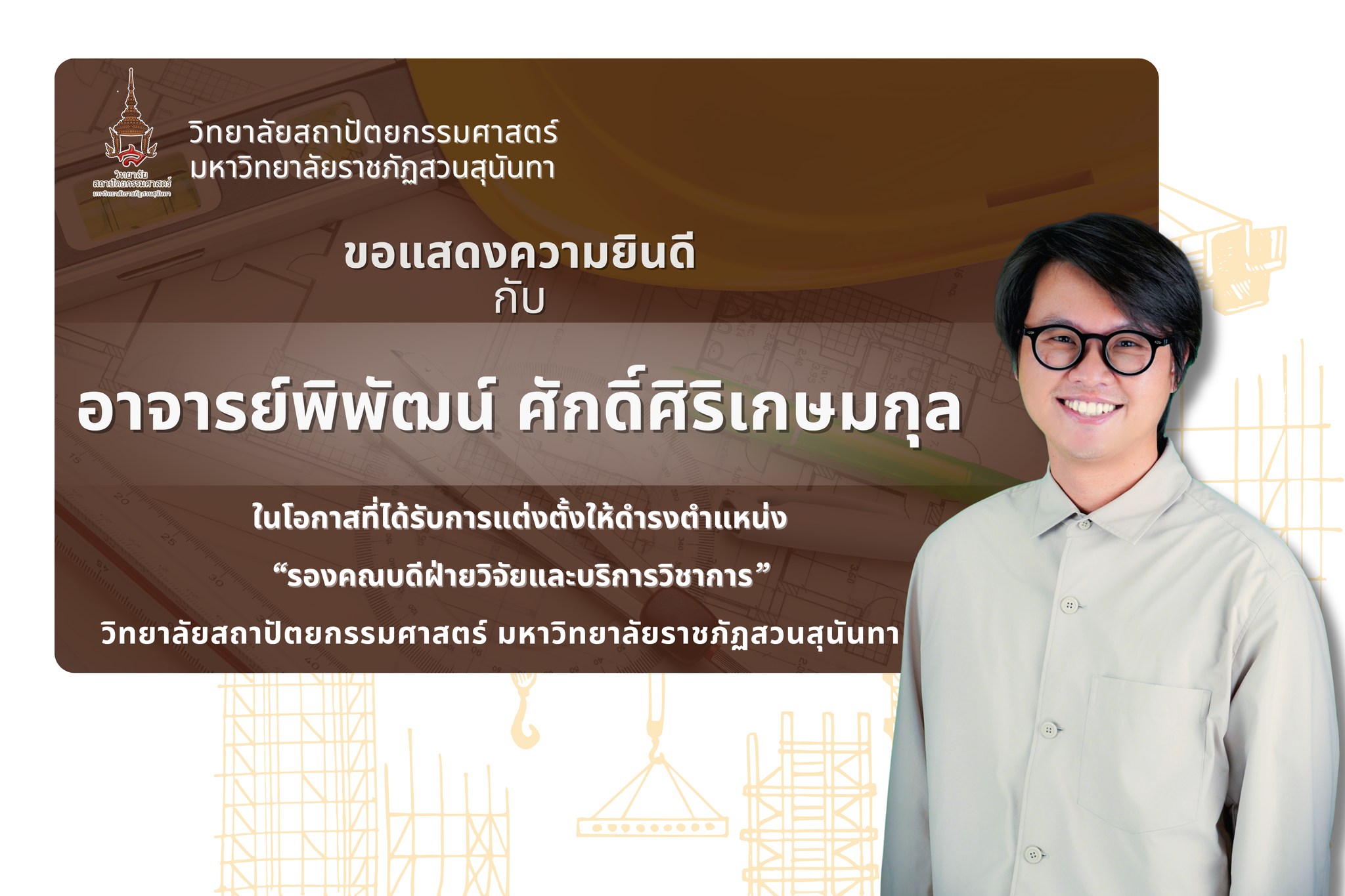 วิทยาลัยสถาปัตยกรรมศาสตร์ มหาวิทยาลัยราชภัฏสวนสุนันทา ขอแสดงความยินดี กับ อาจารย์พิพัฒน์ ศักดิ์ศิริเกษมกุล ในโอกาสที่ได้รับการแต่งตั้งให้ดำรงตำแหน่ง "รองคณบดีฝ่ายวิจัยและบริการวิชาการ" วิทยาลัยสถาปัตยกรรมศาสตร์ มหาวิทยาลัยราชภัฏสวนสุนันทา