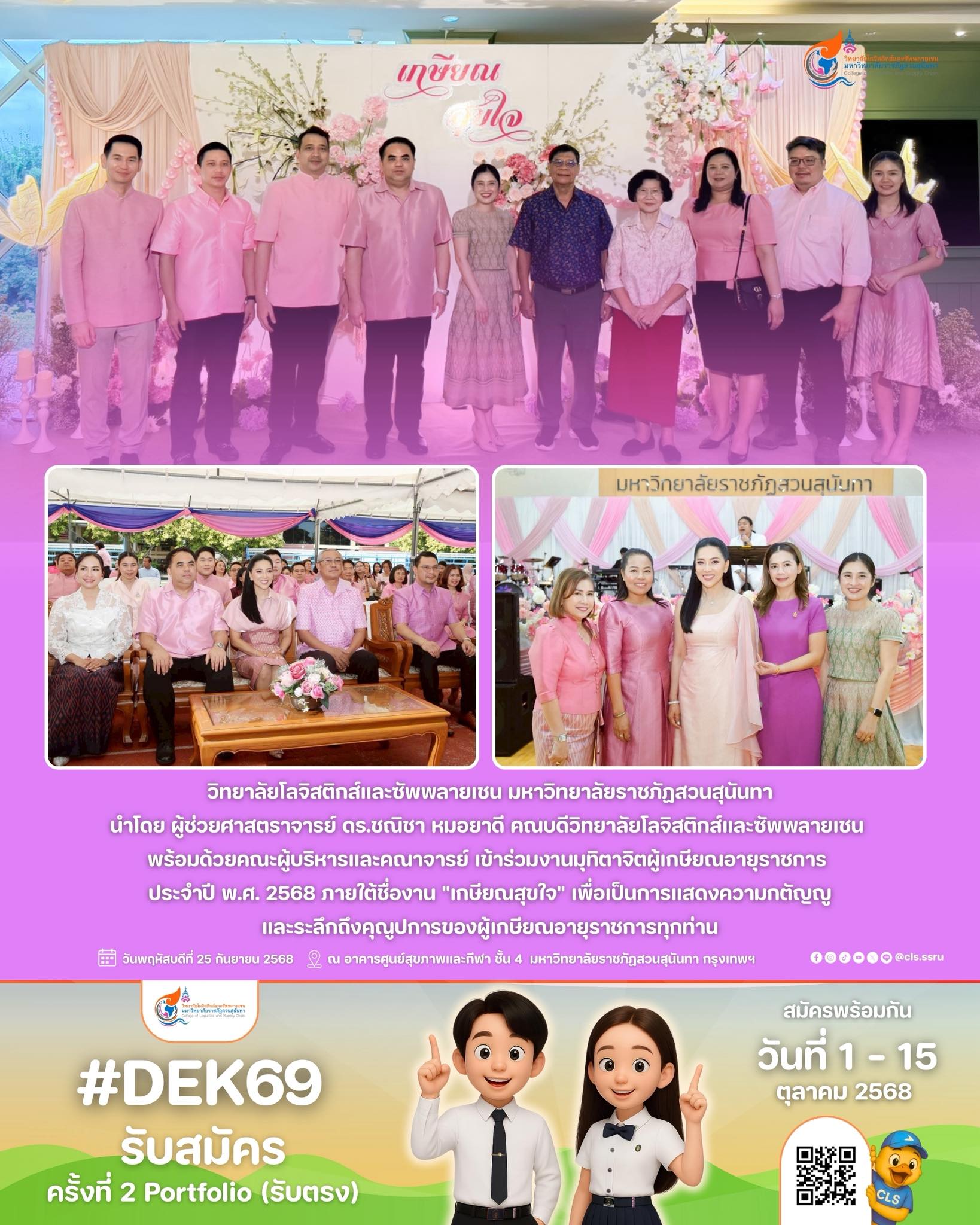 วิทยาลัยโลจิสติกส์และซัพพลายเชน มหาวิทยาลัยราชภัฏสวนสุนันทา นำโดย ผู้ช่วยศาสตราจารย์ ดร.ชณิชา หมอยาดี คณบดีวิทยาลัยโลจิสติกส์และซัพพลายเชน พร้อมด้วยคณะผู้บริหารและคณาจารย์ เข้าร่วมงานมุทิตาจิตผู้เกษียณอายุราชการ ประจำปี พ.ศ. 2568 ภายใต้ชื่องาน "เกษียณสุขใจ" เพื่อเป็นการแสดงความกตัญญูและระลึกถึงคุณูปการของผู้เกษียณอายุราชการทุกท่าน