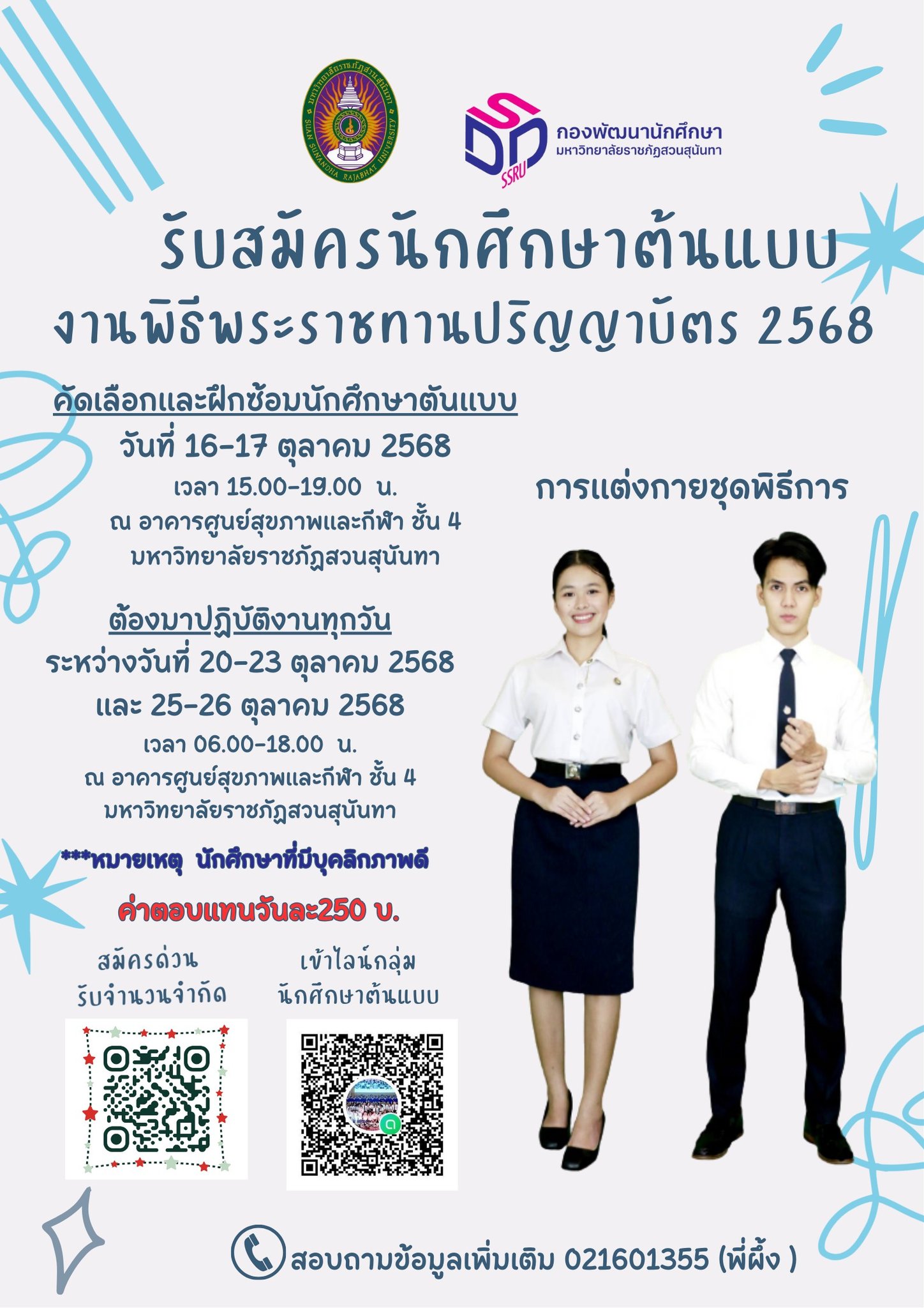 ลงทะเบียน สมัครเป็นนักศึกษาต้นแบบงานปริญญาบัตร ปี 2568 https://forms.gle/Rre829wB6JXRbVQW6