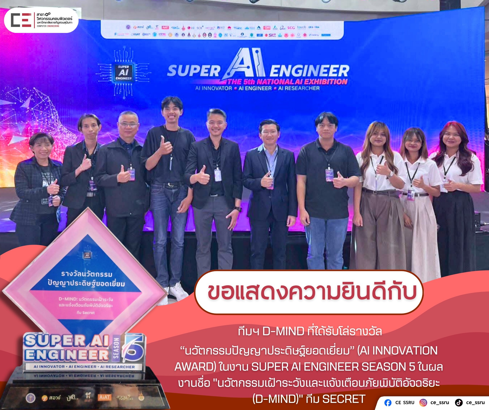 ขอแสดงความยินดีกับทีมฯ D-MIND ที่ได้รับโล่รางวัล “นวัตกรรมปัญญาประดิษฐ์ยอดเยี่ยม” (AI Innovation Award) ในงาน Super AI Engineer Season 5 ในผลงานชื่อ "นวัตกรรมเฝ้าระวังและแจ้งเตือนภัยพิบัติอัจฉริยะ (D-MIND)" ทีม Secret