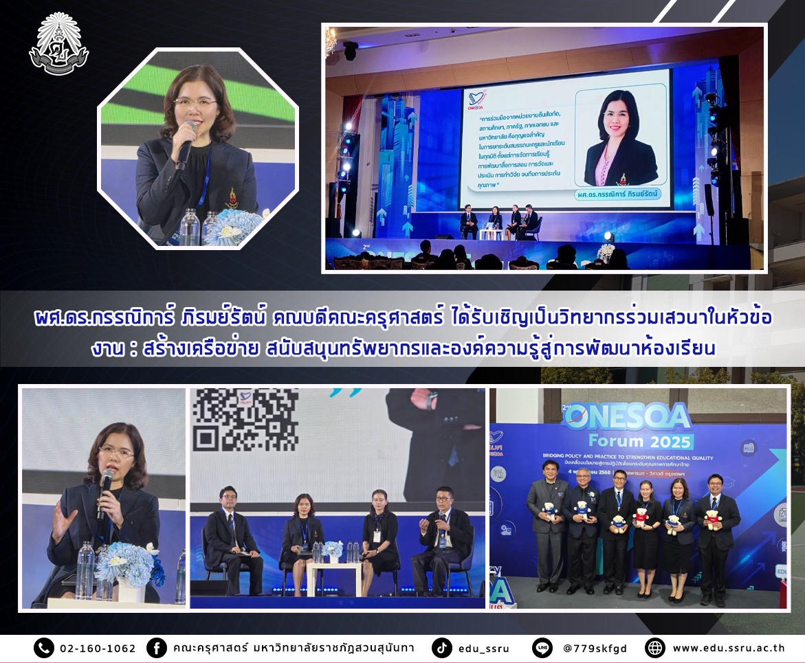 วันที่ 4 พฤศจิกายน 2568 ผู้ช่วยศาสตราจารย์ ดร.กรรณิการ์ ภิรมย์รัตน์ คณบดีคณะครุศาสตร์ มหาวิทยาลัยราชภัฏสวนสุนันทา ได้รับเชิญเป็นวิทยากรร่วมเสวนาในหัวข้อ "งาน : สร้างเครือข่าย สนับสนุนทรัพยากรและองค์ความรู้สู่การพัฒนาห้องเรียน"ในการประชุมวิชาการระดับชาติและนานาชาติ 2025 ONESQA Forum ครั้งที่ 2 ภายใต้หัวข้อ “Bridging Policy and Practice to Strengthen Educational Quality” จัดโดย สำนักรับรองมาตรฐานและประเมินคุณภาพการศึกษา (สมศ.)
