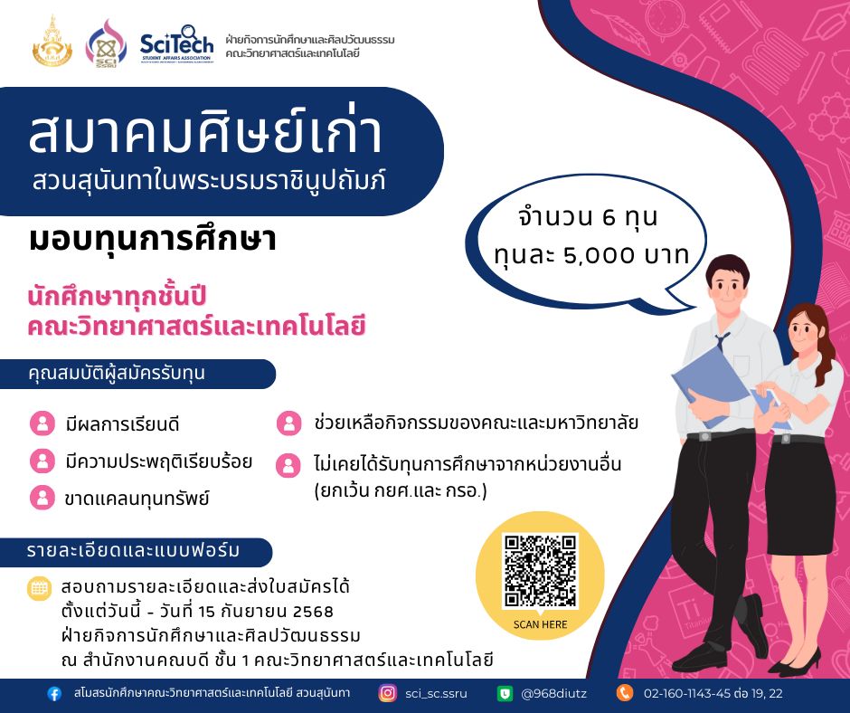 สมาคมศิษย์เก่าสวนสุนันทา ในพระบรมราชินูปถัมภ์ มอบทุนการศึกษา สำหรับนักศึกษาทุกชั้นปี ของคณะวิทยาศาสตร์และเทคโนโลยี จำนวน 6 ทุน ทุนละ 5,000 บาท